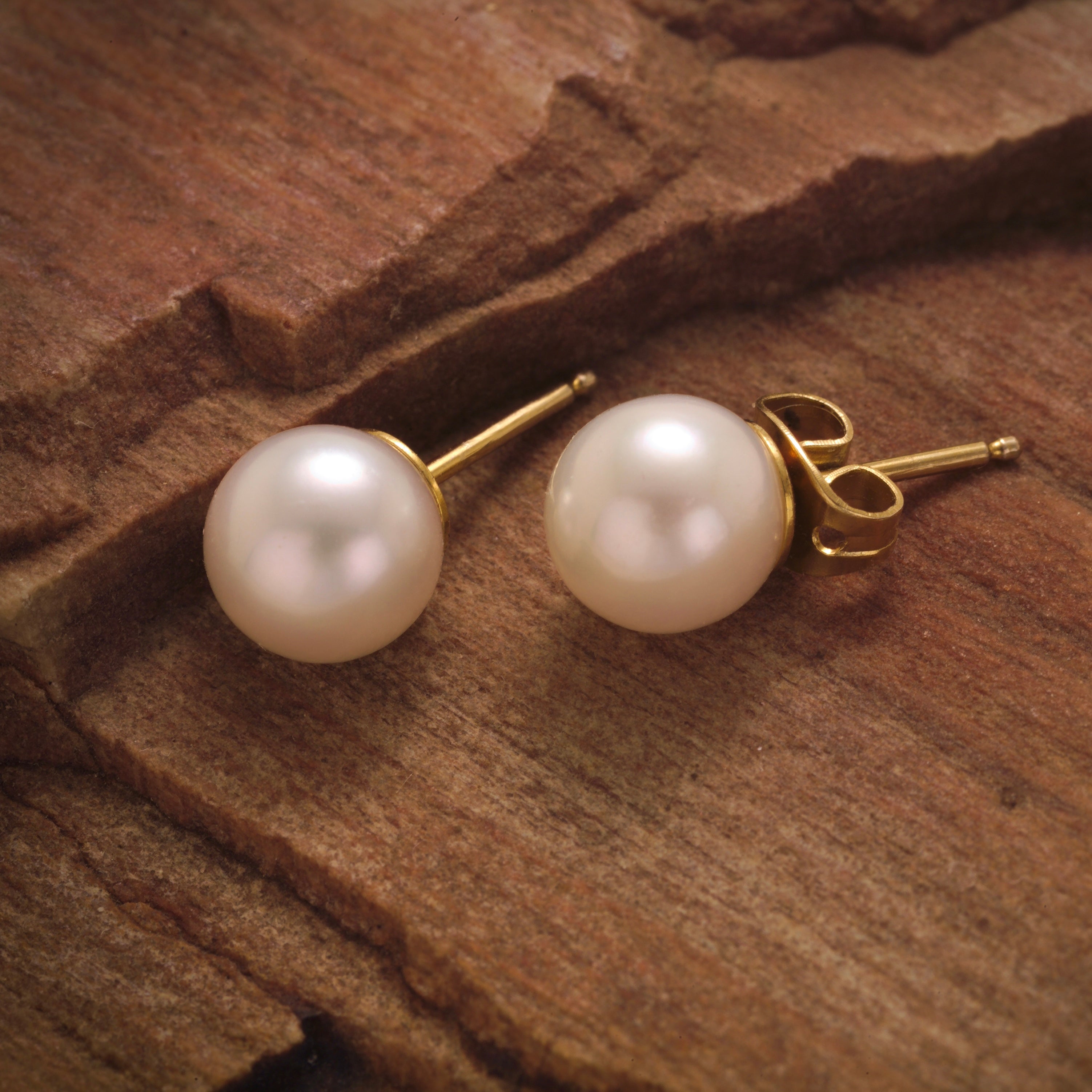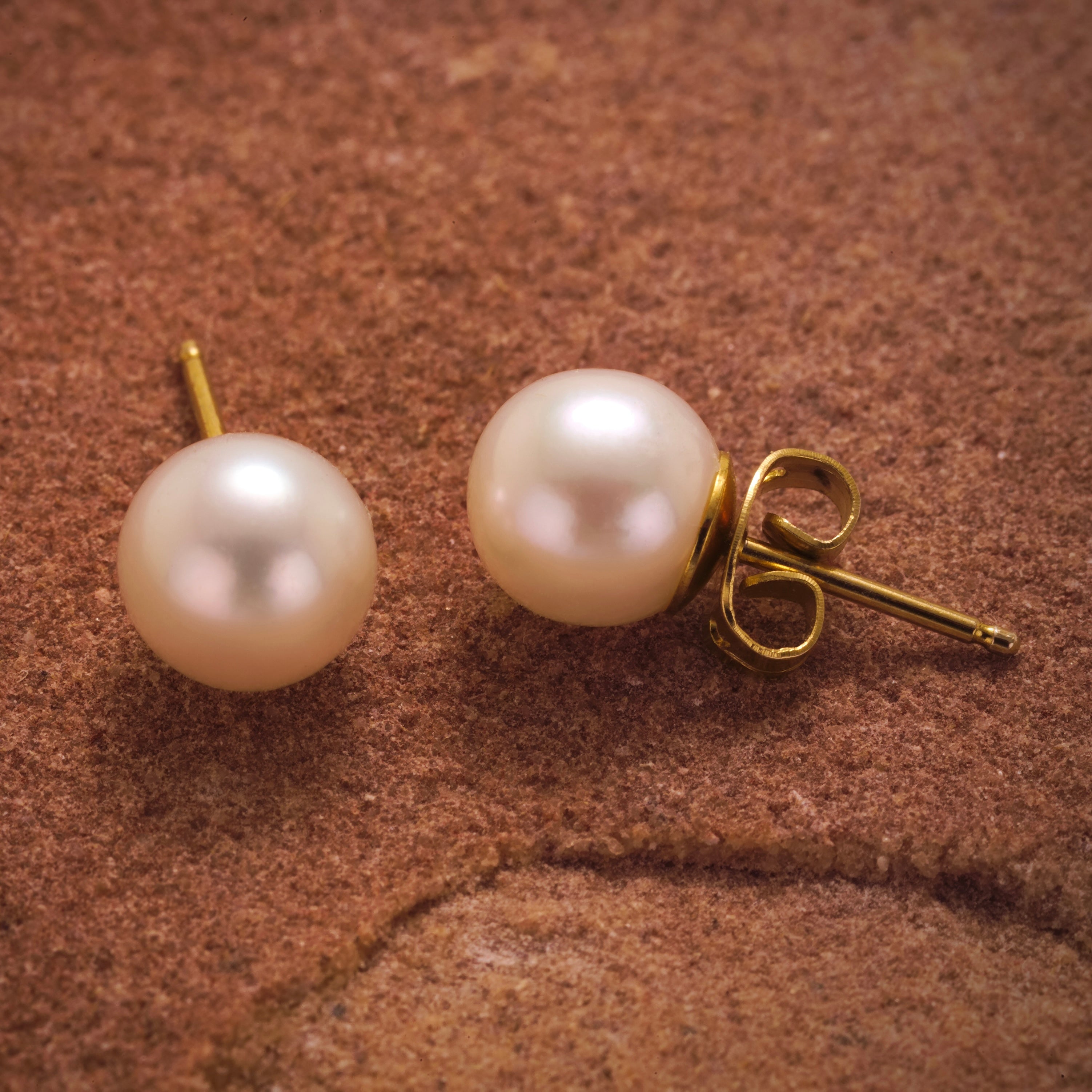These beautiful earrings have shiny white pearls that are about 8 mm big. They are set on strong 925 sterling silver covered with 18K white gold, so they stay bright and don’t fade.
